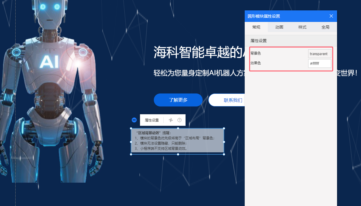 登录网站后台,选择添加模块-->排版布局-->区域背景动效,选中适合的风格样式,拖动到区域布局中,如下图: